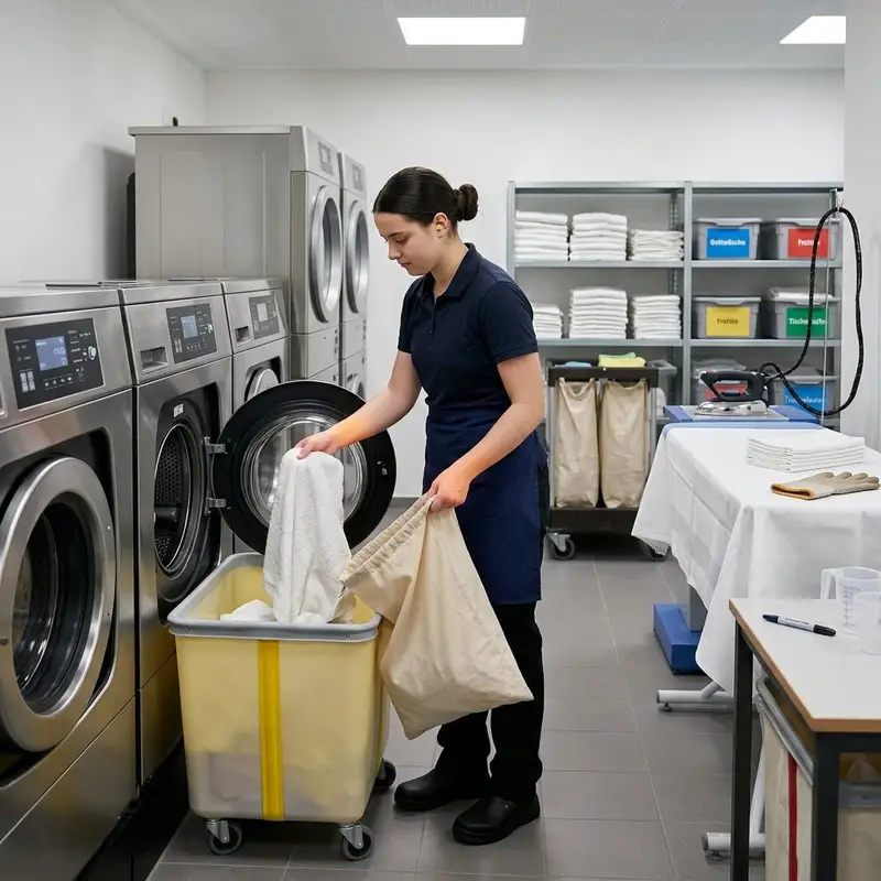 "description": "Du sortierst Hotelwäsche in der Waschküche, bedienst Waschmaschine und Trockner und bügelst die Textilien am Bügeltisch.",