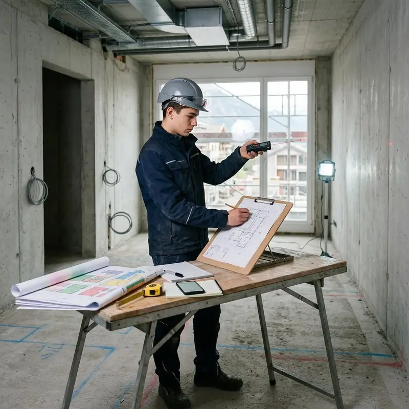 "description": "Du misst mit Meter und Laser die Räume im Gebäude aus und notierst die Masse auf dem Baustellenplan.",