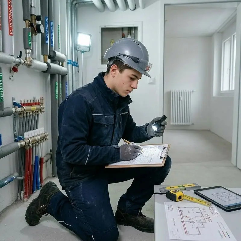 "description": "Du prüfst auf der Baustelle die installierten Rohre und Heizkörper, kontrollierst die Anschlüsse und hältst Abweichungen im Protokoll fest.",