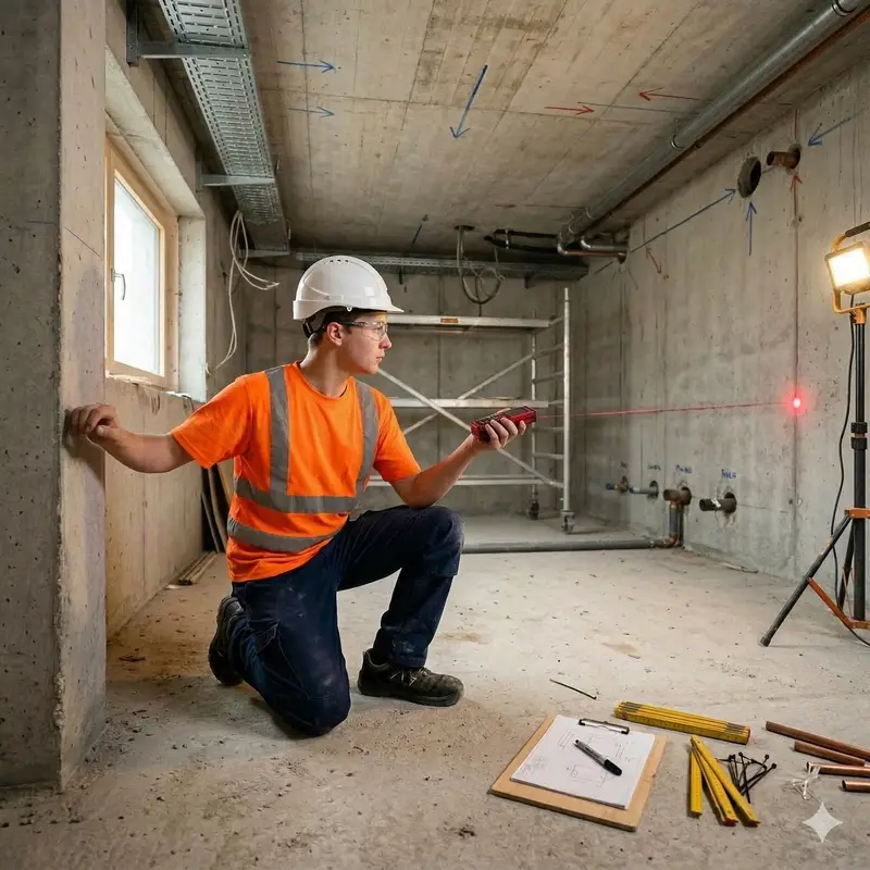 "description": "Du misst auf der Baustelle mit Bandmass und Laser die Räume und Leitungswege aus, damit die Kühlanlage später passt.",