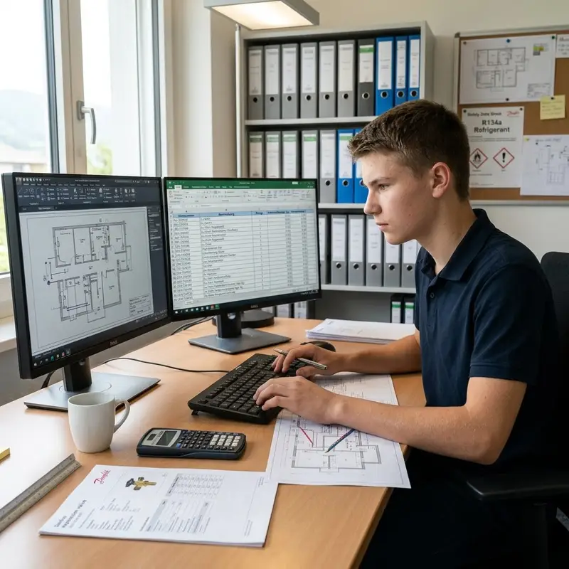 "description": "Du berechnest am Computer die benötigten Rohrlängen, Ventile und die Menge Kältemittel und trägst alles in eine Stückliste ein.",