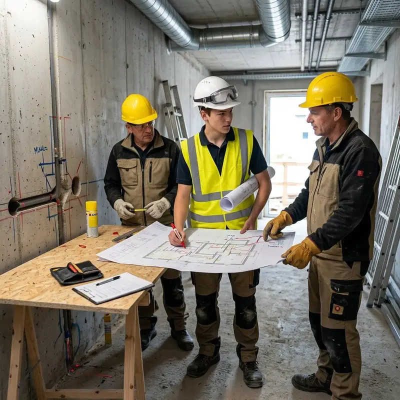 "description": "Du besprichst auf der Baustelle mit Helm und Planrolle die Montage mit Installateuren und markierst am Bauplan die nächsten Arbeitsschritte.",