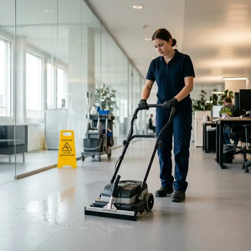"description": "Du scheuerst den Boden in einem Büro mit einer Scheuersaugmaschine und saugst das Schmutzwasser direkt ab.",