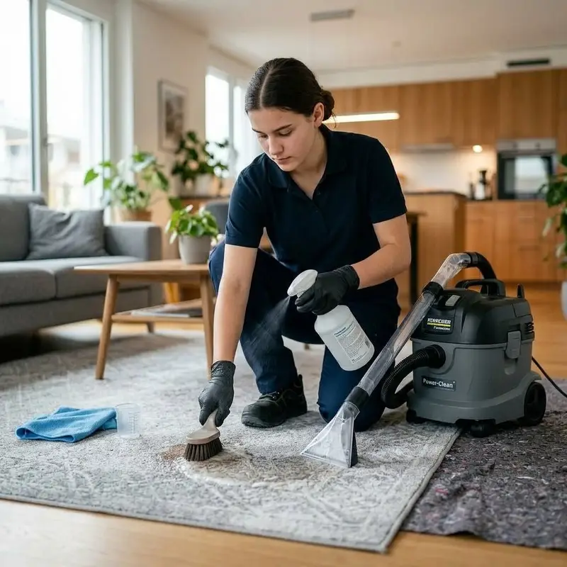 "description": "Du sprühst Fleckenlöser auf einen Teppich in einer Wohnung und arbeitest ihn mit einer Bürste und einem Nasssauger aus.",