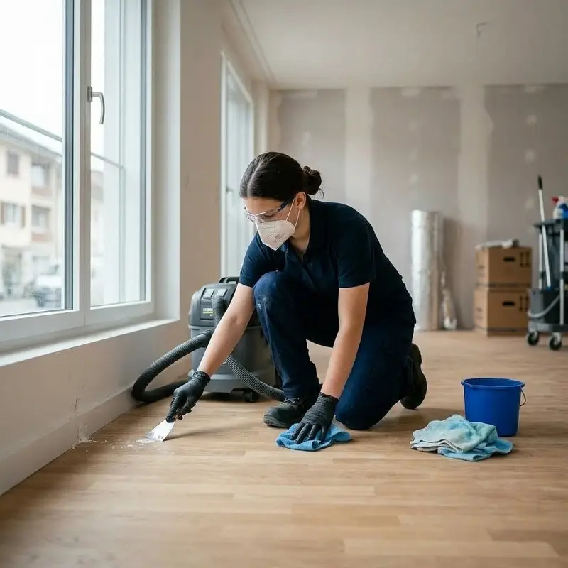 "description": "Du entfernst Baustaub und Farbspritzer in einer Neubauwohnung mit Spachtel, Mikrofasertuch und Staubsauger vor der Schlüsselübergabe.",