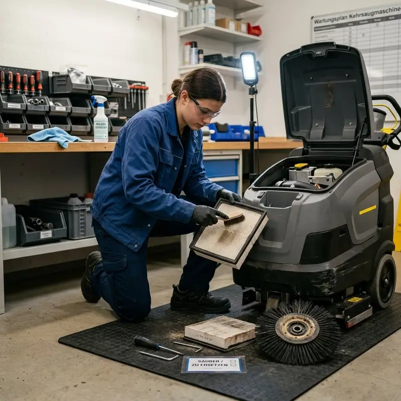 "description": "Du reinigst Filter und Bürsten einer Kehrsaugmaschine in der Werkstatt und prüfst sie auf Abnutzung.",