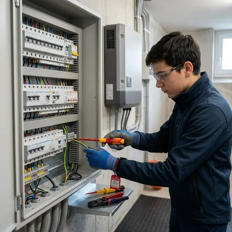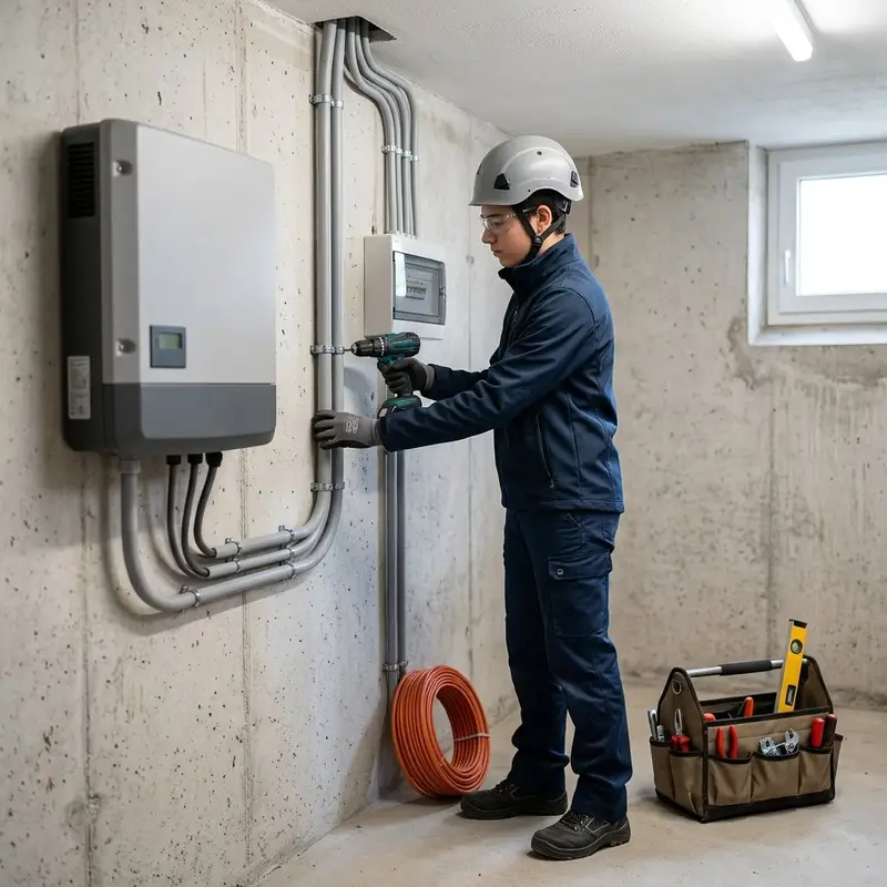 "description": "Du schliesst Wechselrichter und Sicherungen im Schaltschrank an und verbindest die Solaranlage mit dem Stromnetz.",