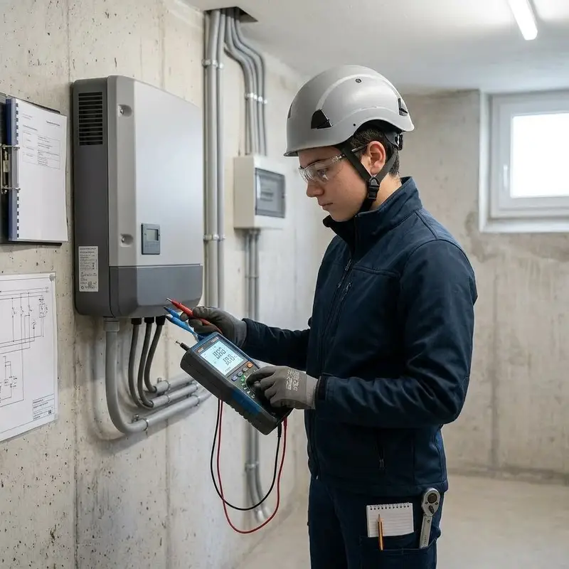 "description": "Du misst Spannung und Leistung mit einem Messgerät an der Anlage und kontrollierst am Display, ob alles korrekt arbeitet.",