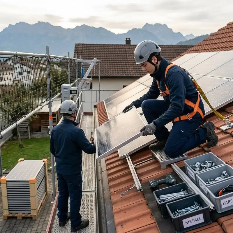 "description": "Du montierst Solarmodule mit Schienen und Schrauben auf einem Hausdach und sicherst dich dabei mit Helm und Gurt.",