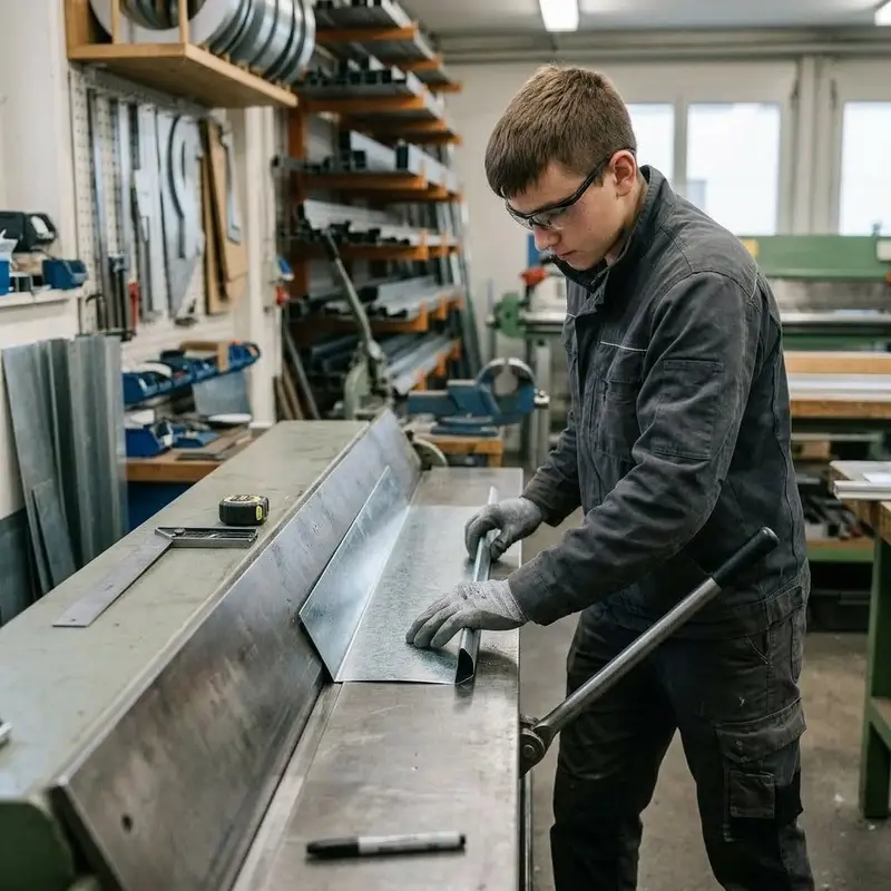 "description": "Du biegst und falzt das Metall an der Abkantbank zu einer Dachrinne oder einem Blechprofil.",