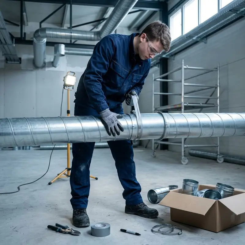"description": "Du setzt Lüftungsrohre zusammen und dichtest die Verbindungen mit Dichtband und Schellen ab.",