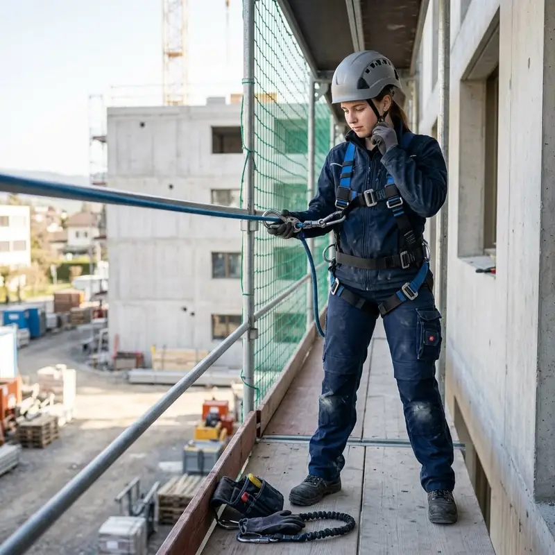 "description": "Du legst auf dem Gerüst Helm und Sicherheitsgurt an und sicherst dich am Seil gegen Absturz.",
