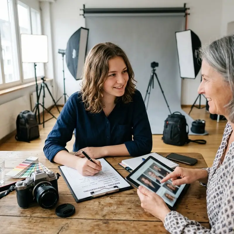 "description": "Du besprichst im Studio mit deiner Kundin die Bildideen und notierst Wünsche und Zweck des Shootings auf einem Formular.",