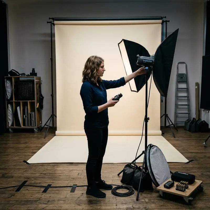 "description": "Du baust im Fotostudio Hintergrund, Stative und Blitzlichter auf und richtest das Licht mit einem Belichtungsmesser ein.",