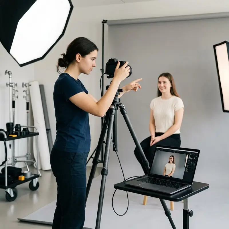 "description": "Du positionierst eine Person vor dem Hintergrund, gibst Posing-Anweisungen und fotografierst mit der Kamera auf dem Stativ.",