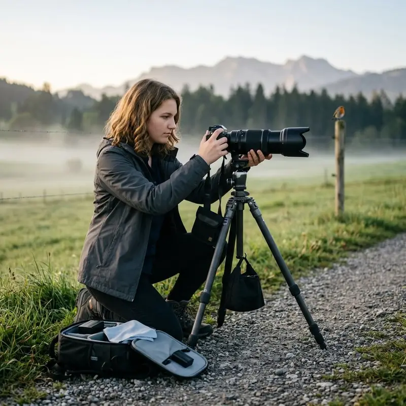 "description": "Du fotografierst draussen eine Landschaft oder ein Tier mit Teleobjektiv und stellst die Kameraeinstellungen vor Ort passend zum Licht ein.",