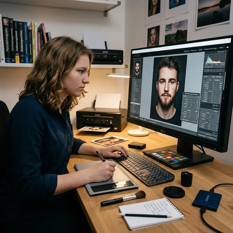 "description": "Du bearbeitest die Bilder am Computer, retuschierst Haut und Staubflecken und passt Farben und Kontrast in einem Bildbearbeitungsprogramm an.",