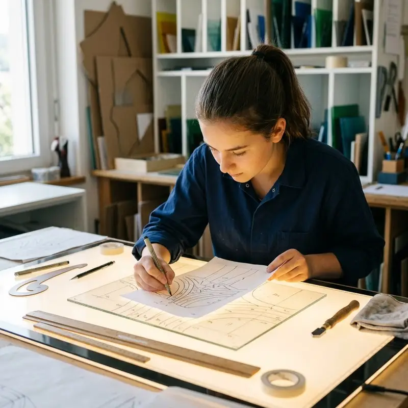 "description": "Du zeichnest in deinem Atelier einen Entwurf auf Papier und überträgst die Linien auf eine Glasscheibe am Leuchttisch.",