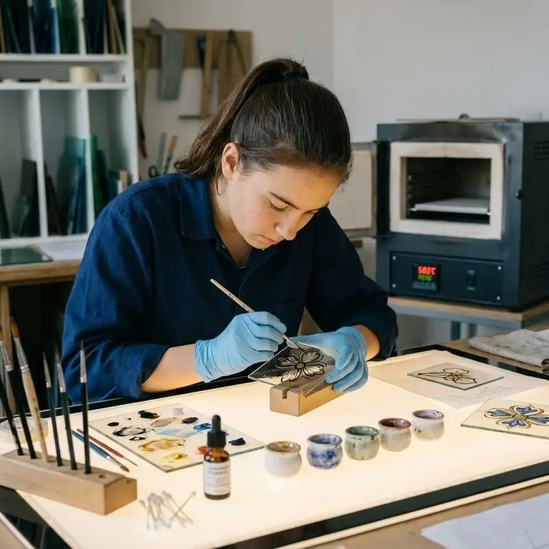"description": "Du malst mit Glasfarben und feinen Pinseln Details auf die Glasstücke und brennst die Farbe danach im Ofen ein.",