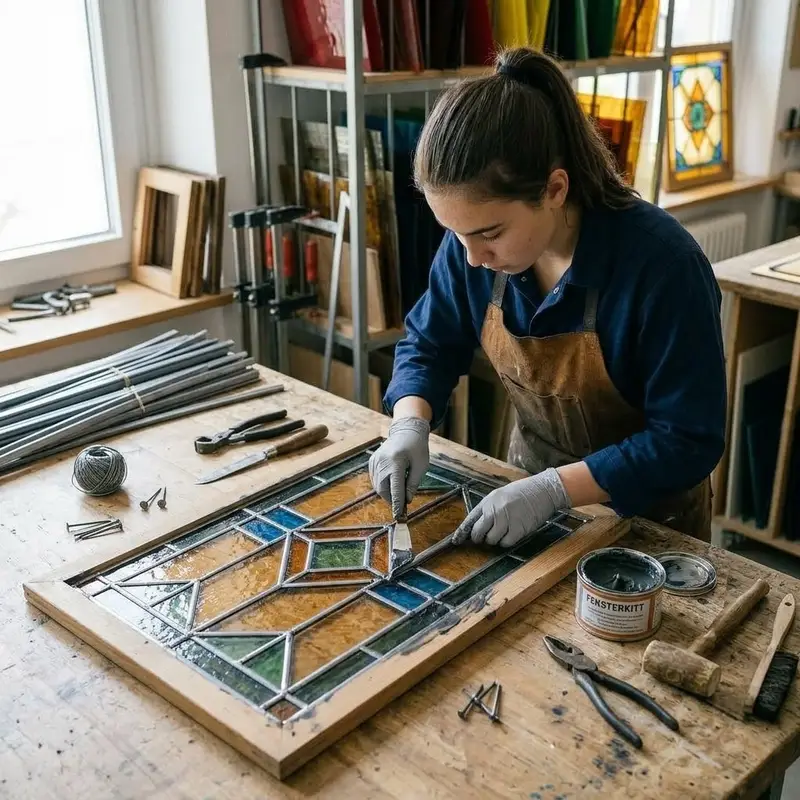 "description": "Du setzt die bemalten Glasstücke mit Bleiruten in einem Rahmen zusammen und dichtest das Fenster mit Kitt in der Werkstatt ab.",