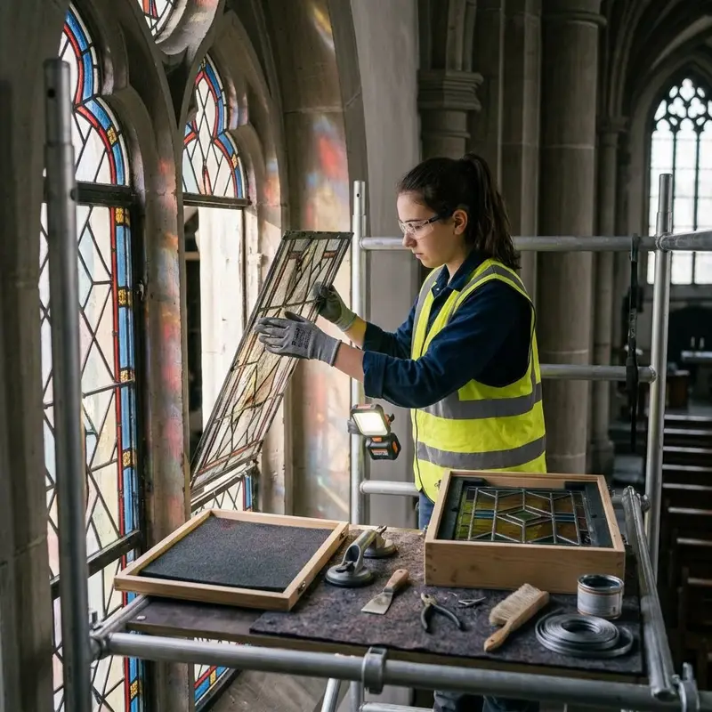 "description": "Du entfernst in einer Kirche ein beschädigtes Glasfeld, ersetzt ein gesprungenes Teilstück und setzt das restaurierte Feld wieder ein.",