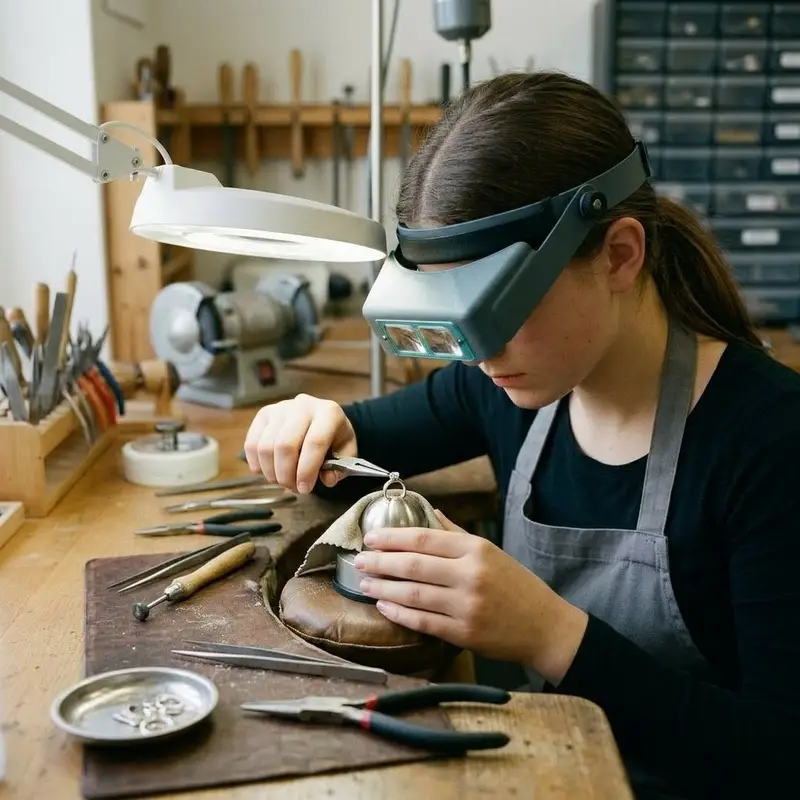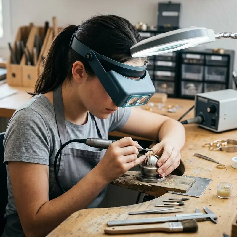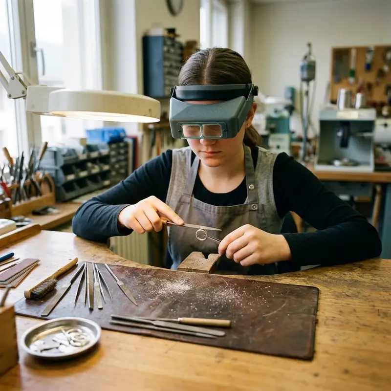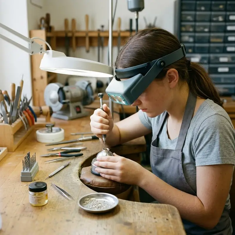 "description": "Du bohrst mit einem feinen Bohrer präzise Löcher in ein Schmuckteil aus Metall an der Werkbank.",
