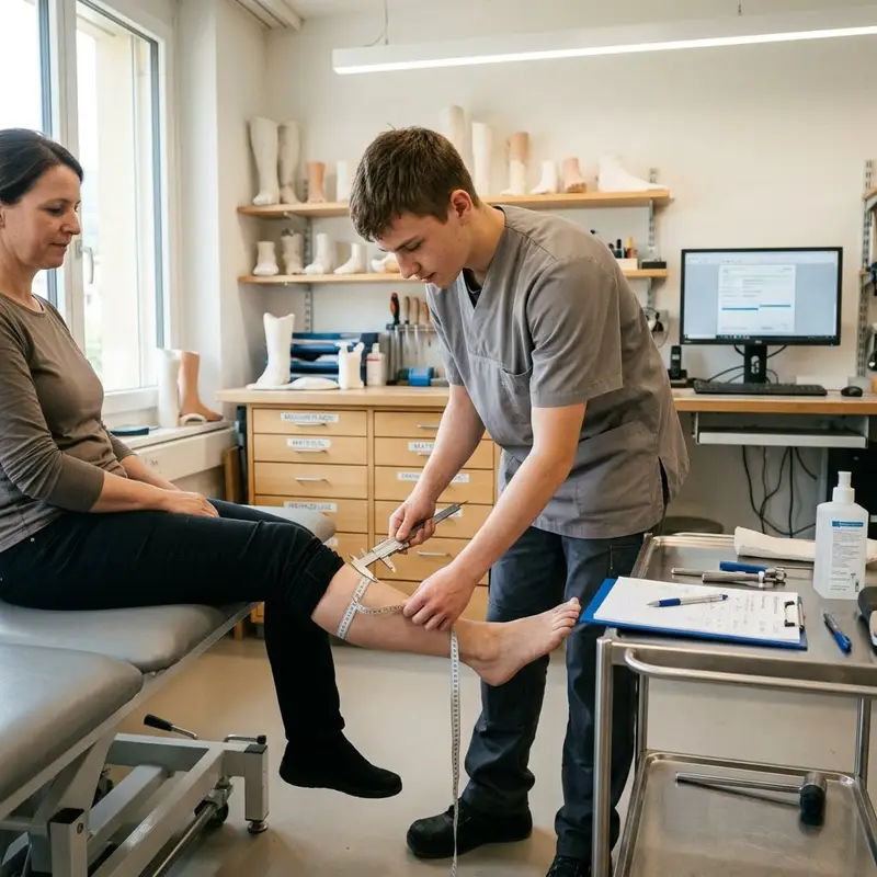 "description": "Du misst mit Massband und Messschieber die betroffene Körperpartie deiner Kundin in der orthopädischen Werkstatt.",