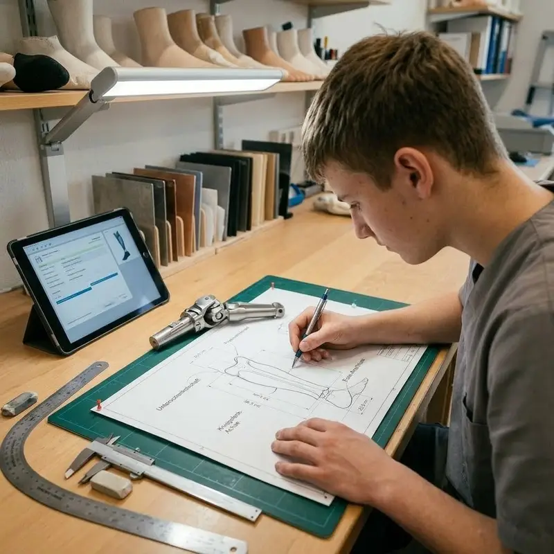 "description": "Du zeichnest am Arbeitstisch eine Skizze und ein Modell der Prothese oder Orthese nach den gemessenen Daten.",