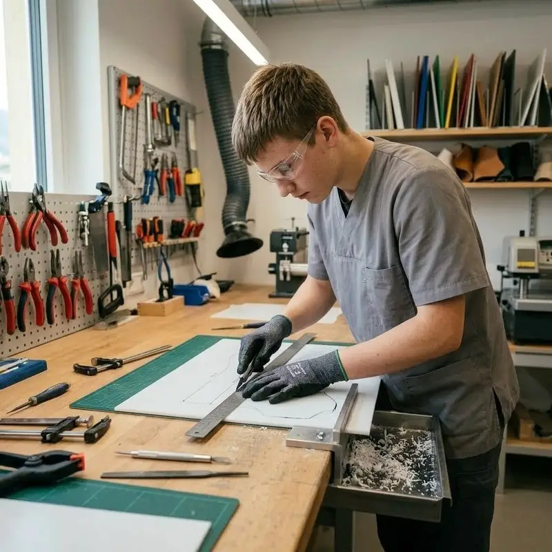 "description": "Du schneidest Kunststoff, Leder oder Metall mit Säge und Cutter in Form, um Bauteile für das Hilfsmittel herzustellen.",