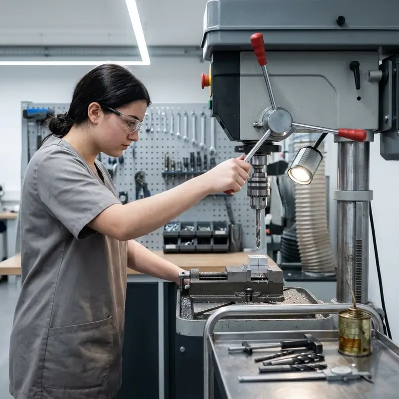 "description": "Du bohrst an der Ständerbohrmaschine präzise Löcher in die Bauteile, damit sie später verschraubt werden können.",