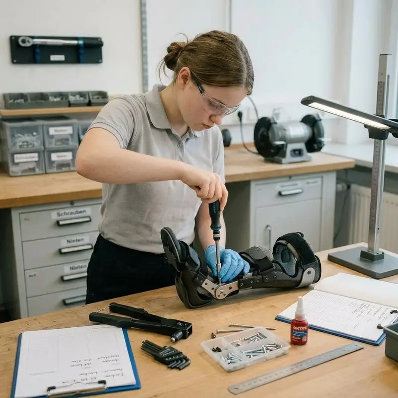 "description": "Du verschraubst und nietest die Teile auf der Werkbank zu einem fertigen orthopädischen Hilfsmittel und prüfst den festen Sitz.",