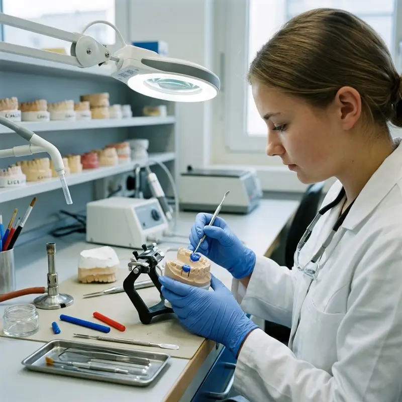 "description": "Du modellierst im Dentallabor mit Wachs oder Kunststoff ein Zahn- und Kiefermodell auf dem Arbeitstisch.",