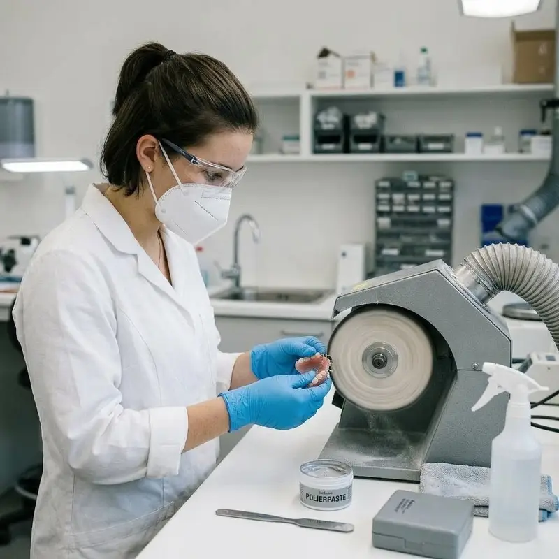 "description": "Du hältst die Prothese an die Poliermaschine und polierst sie mit Bürsten und Paste glänzend.",