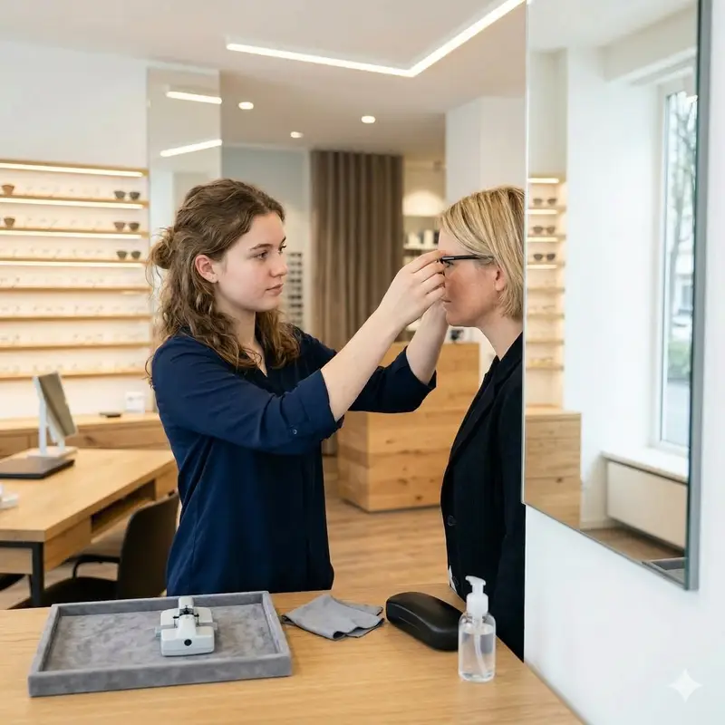 "description": "Du berätst Kundinnen und Kunden im Fachgeschäft und lässt sie verschiedene Brillenfassungen vor dem Spiegel anprobieren.",