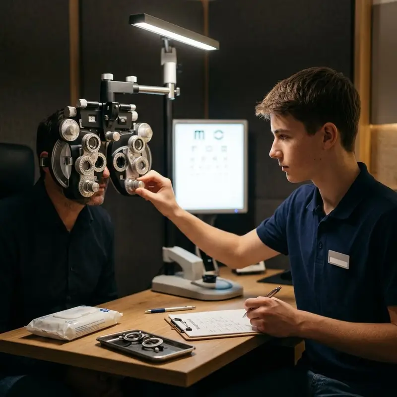 "description": "Du misst an einem Sehtestgerät die Sehstärke der Kundschaft und notierst die Werte am Arbeitsplatz.",