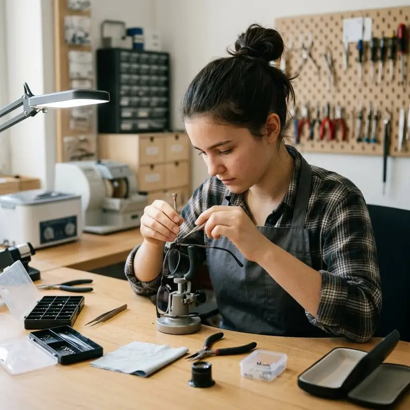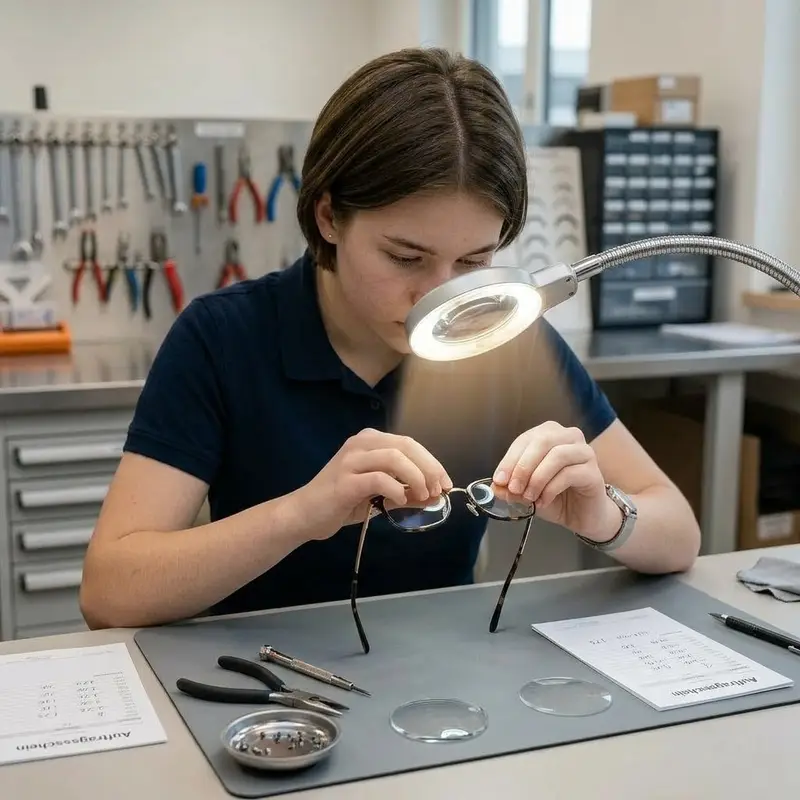 "description": "Du ersetzt in der Werkstatt ein verbogenes Scharnier oder eine lose Schraube an einer Brille und prüfst den Sitz.",