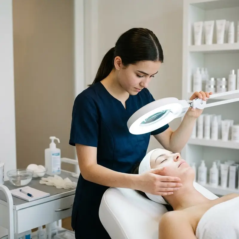 "description": "Du untersuchst im Kosmetiksalon die Gesichtshaut der Kundin mit einer Lupenlampe und bestimmst ihren Hauttyp.",