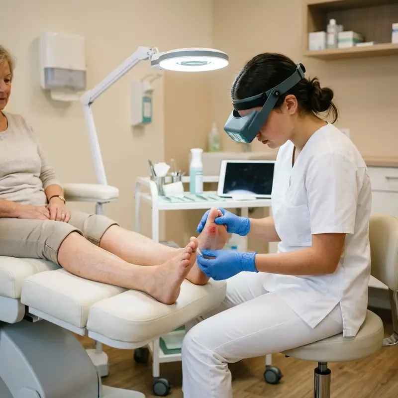 "description": "Du untersuchst die Füsse deiner Patientin auf der Behandlungsliege mit Lampe und Lupenbrille und erkennst Druckstellen und Entzündungen.",