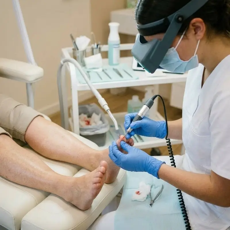 "description": "Du kürzt und bearbeitest einen eingewachsenen Zehennagel mit Zange und Fräser am Podologie-Stuhl.",