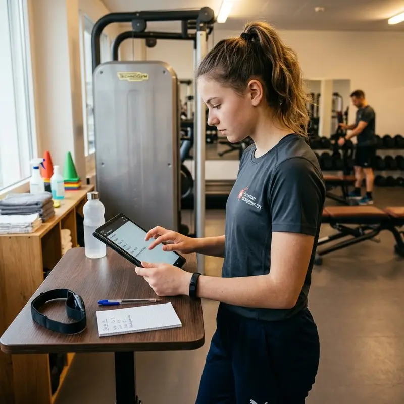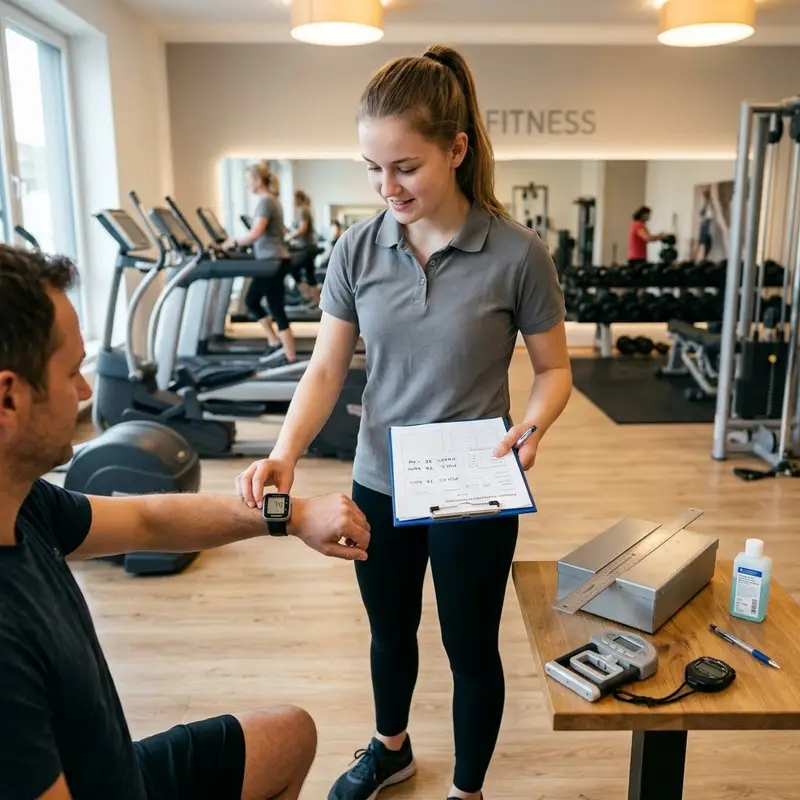 "description": "Du misst im Fitnessstudio Puls, Beweglichkeit und Kraft einer Person mit Testgeräten und Notizblatt.",