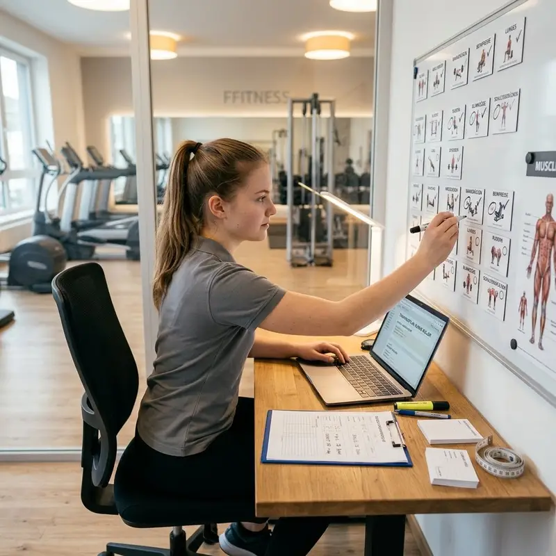 "description": "Du stellst am Schreibtisch einen Trainingsplan zusammen und markierst Übungen auf einer Übungstafel.",