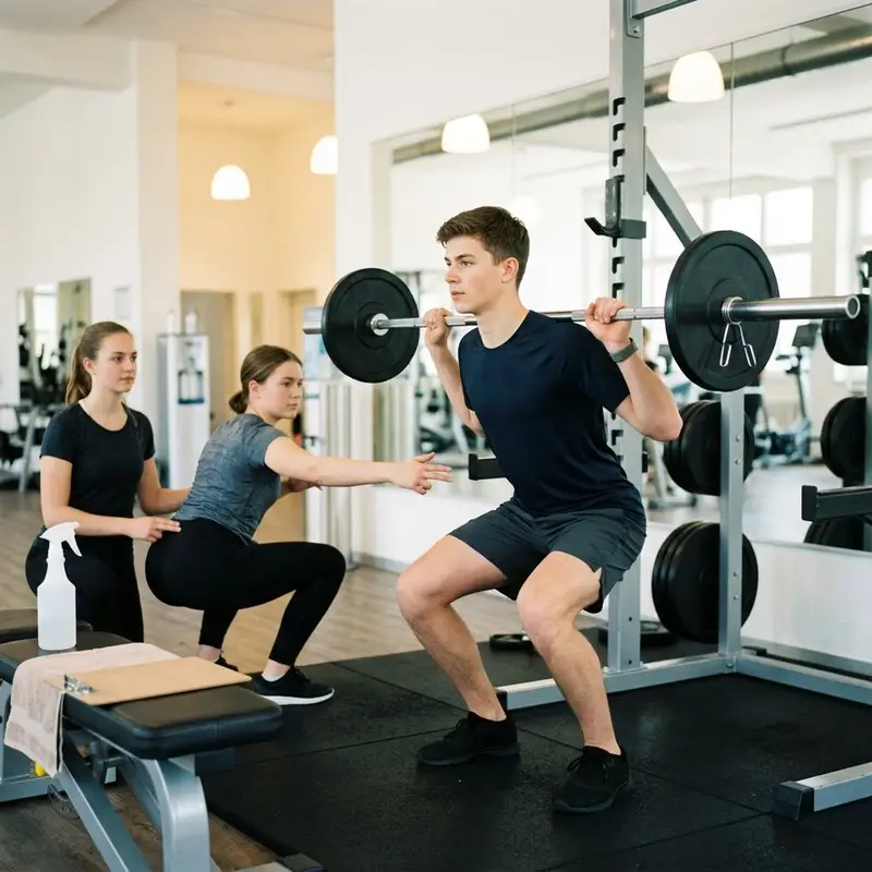 "description": "Du zeigst in der Trainingshalle eine Kniebeuge mit Langhantel und korrigierst die Haltung der Person neben dir.",