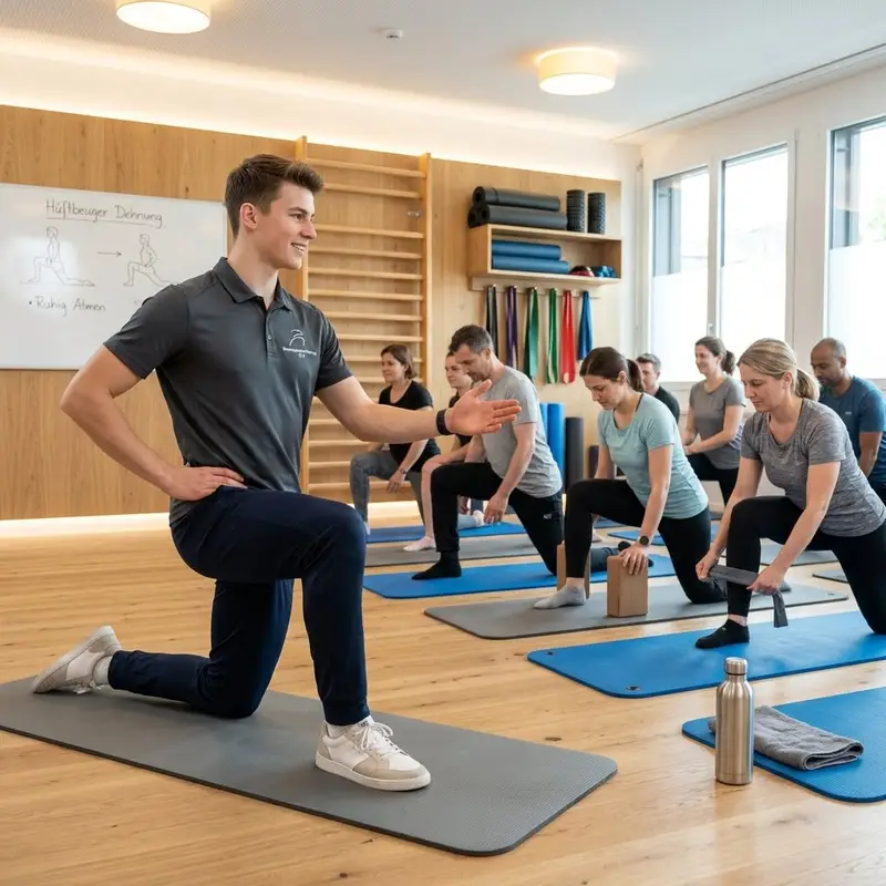"description": "Du leitest in einem Kursraum eine Gruppe durch ein Mobilitäts- und Dehnprogramm auf Matten.",