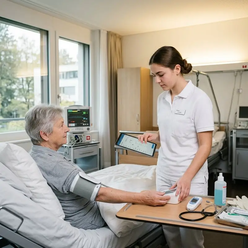 "description": "Du misst im Spitalzimmer mit Blutdruckmanschette und Thermometer die Vitalzeichen deiner Patientin und notierst die Werte am Tablet.",