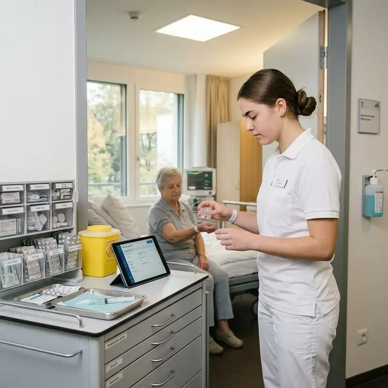 "description": "Du bereitest am Medikamentenwagen Tabletten und eine Injektion vor und verabreichst sie dem Patienten nach Kontrolle des Armbands.",