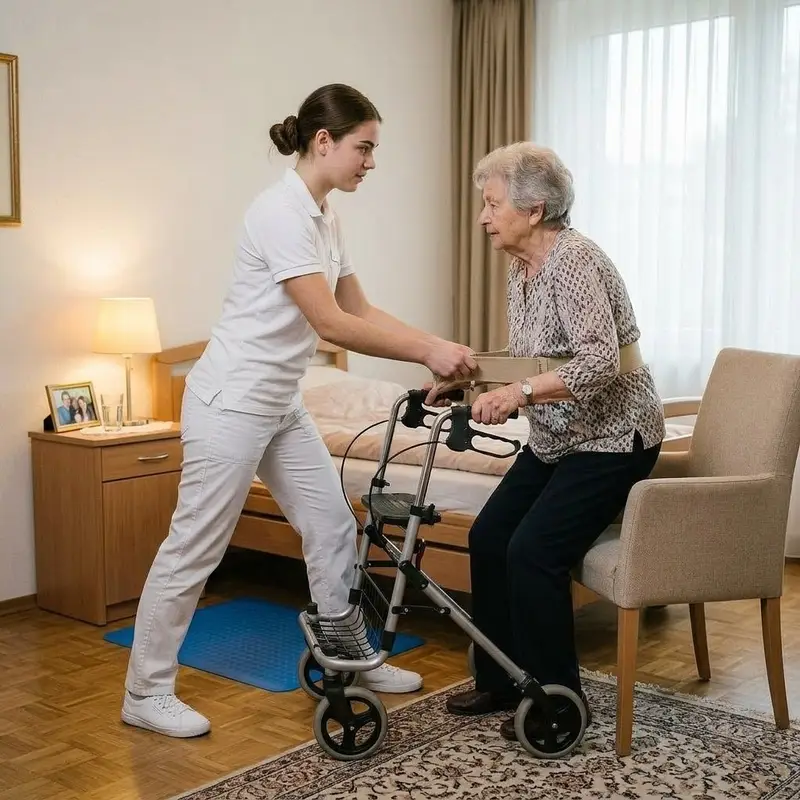 "description": "Du hilfst einer Bewohnerin im Pflegeheim mit Rollator und Gurt vom Bett in den Stuhl aufzustehen und sicher umzusetzen.",