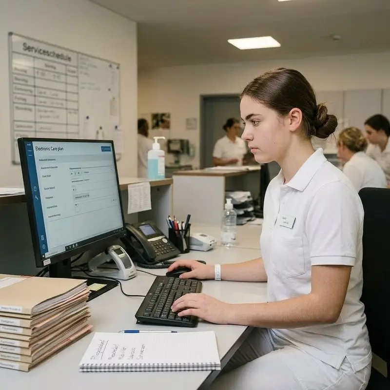 "description": "Du sitzt am Stützpunkt vor dem Computer, schätzt den Pflegebedarf ein und erstellst einen Pflegeplan im elektronischen Dossier.",