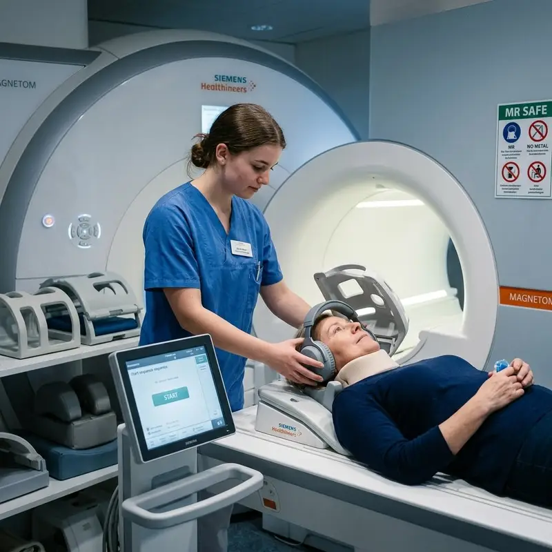 "description": "Du legst der Patientin Kopfhörer an und startest die Magnetresonanztomografie am Kontrollmonitor im MR-Raum.",