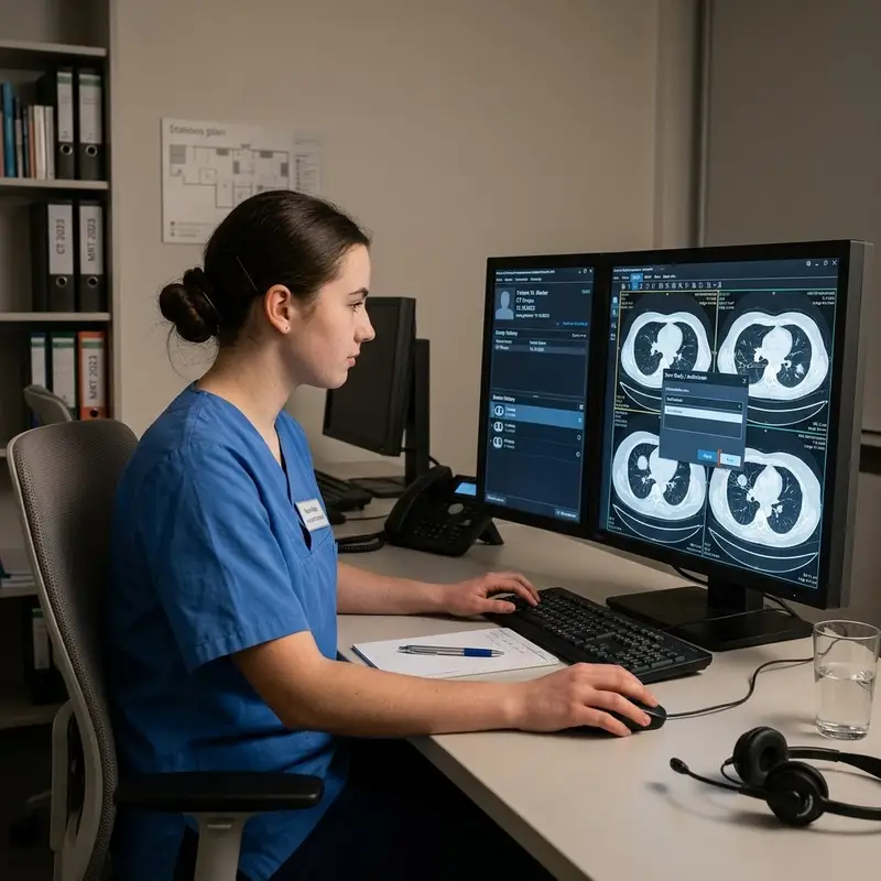 "description": "Du markierst am Computer die relevanten Schnittbilder und speicherst die Untersuchung im Bildarchiv für die Ärztin.",