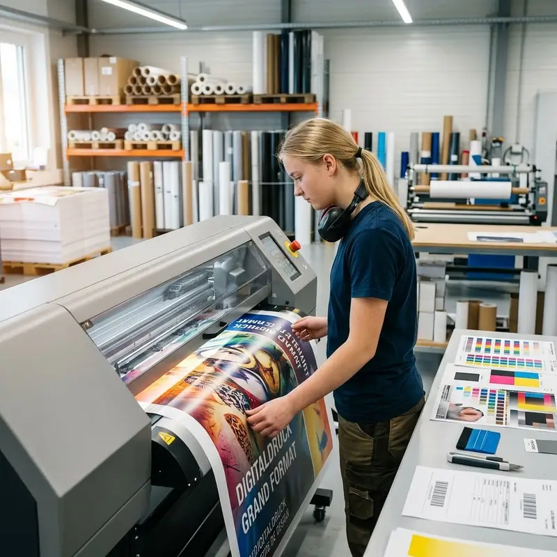"description": "Du druckst ein grosses Motiv an der Digitaldruckmaschine auf ein Banner-Material im Betrieb.",
